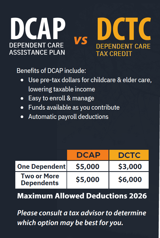 Note: This webpage only contains a summary and partial listing of DCAP Plan benefits, terms, conditions, exclusions and limitations. For a full and complete listing, please refer to the appropriate plan document. If any differences appear between this summary and the plan document, the information in the plan document shall govern.